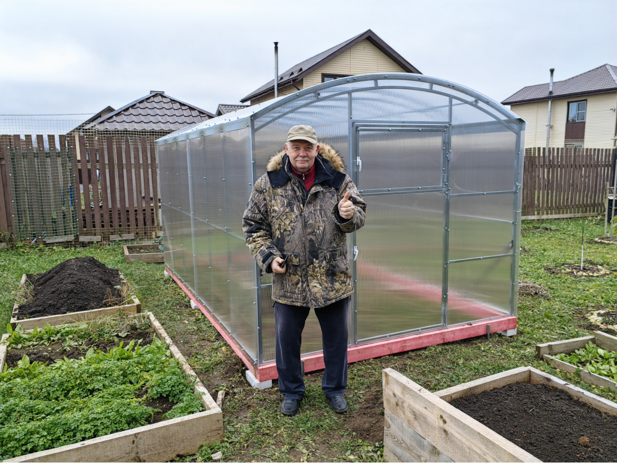 Возможна самостоятельная сборка по подробной инструкции. Сборка теплицы монтажниками-профессионалами компании занимает порядка 3 часов. В качестве основания рекомендуется использовать бетонный, либо деревянный фундамент из бруса. Предварительно брус необходимо обработать антисептиком. Полный комплект состоит из: