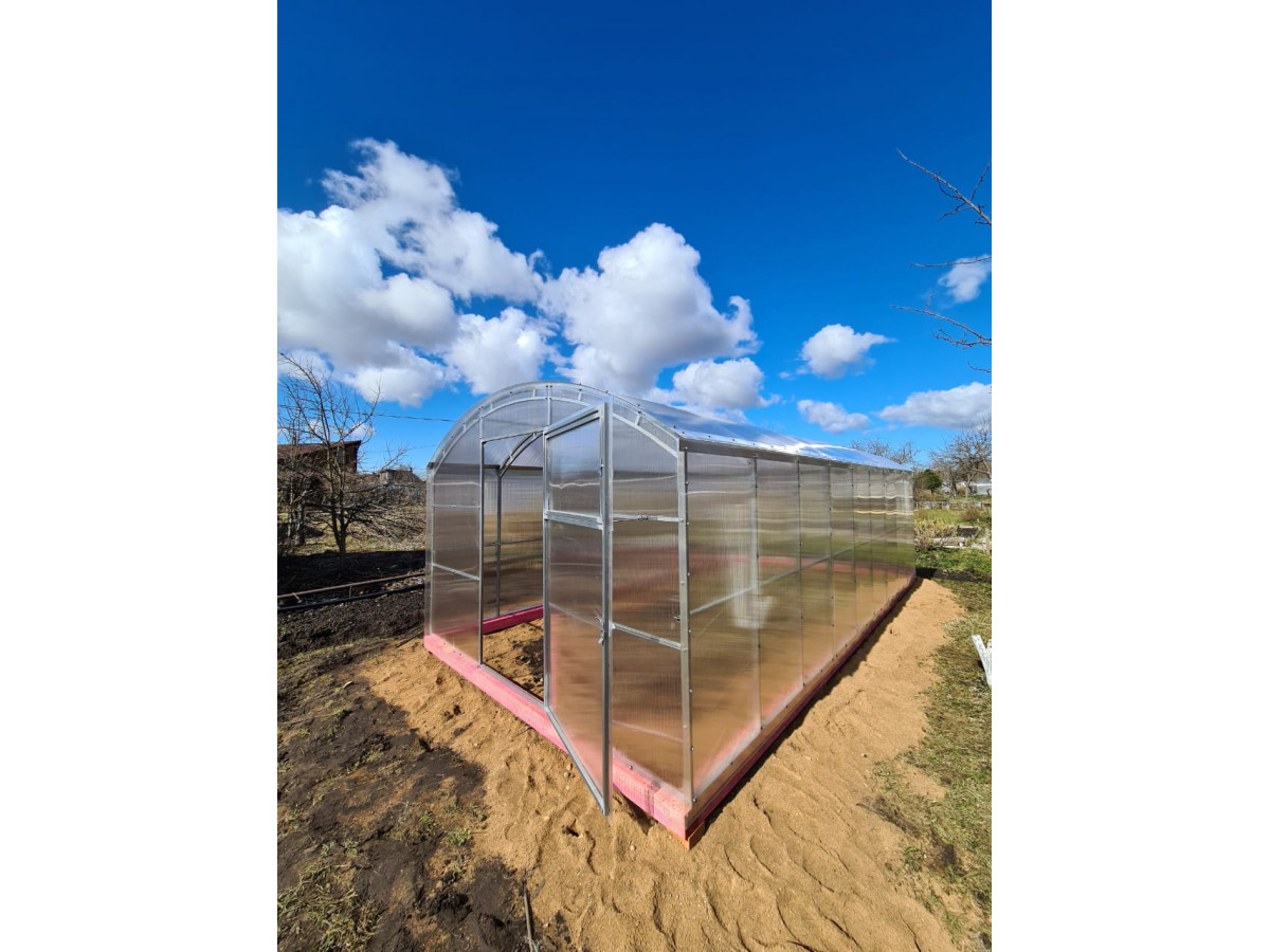 Возможна самостоятельная сборка по подробной инструкции. Сборка теплицы монтажниками-профессионалами компании занимает порядка 3 часов. В качестве основания рекомендуется использовать бетонный, либо деревянный фундамент из бруса. Предварительно брус необходимо обработать антисептиком. Полный комплект состоит из: