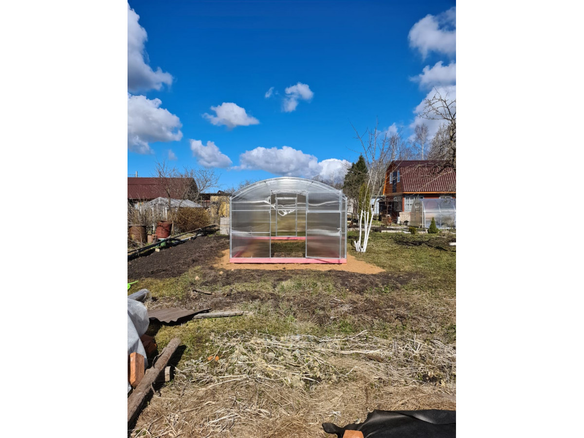 Возможна самостоятельная сборка по подробной инструкции. Сборка теплицы монтажниками-профессионалами компании занимает порядка 3 часов. В качестве основания рекомендуется использовать бетонный, либо деревянный фундамент из бруса. Предварительно брус необходимо обработать антисептиком. Полный комплект состоит из: